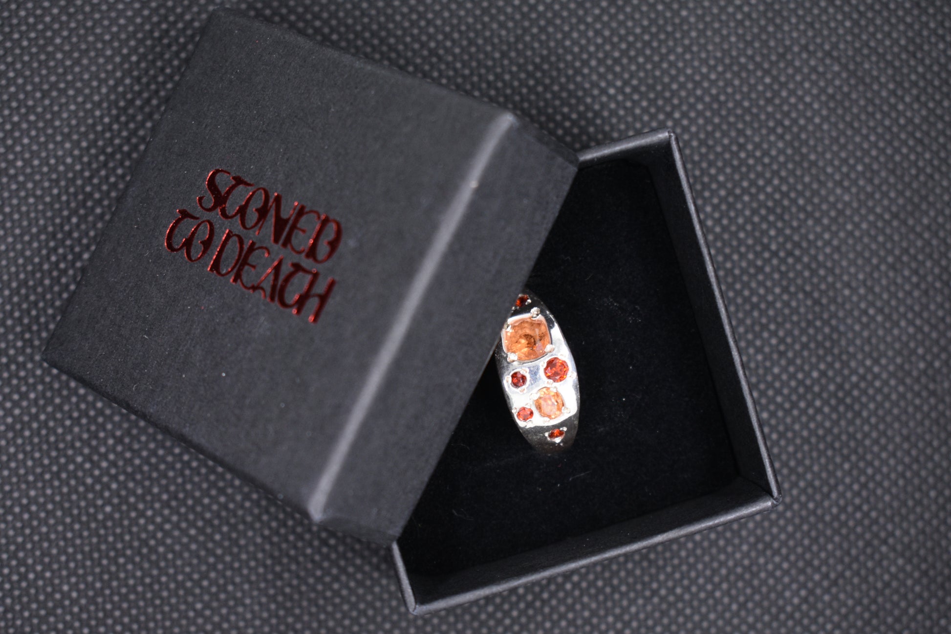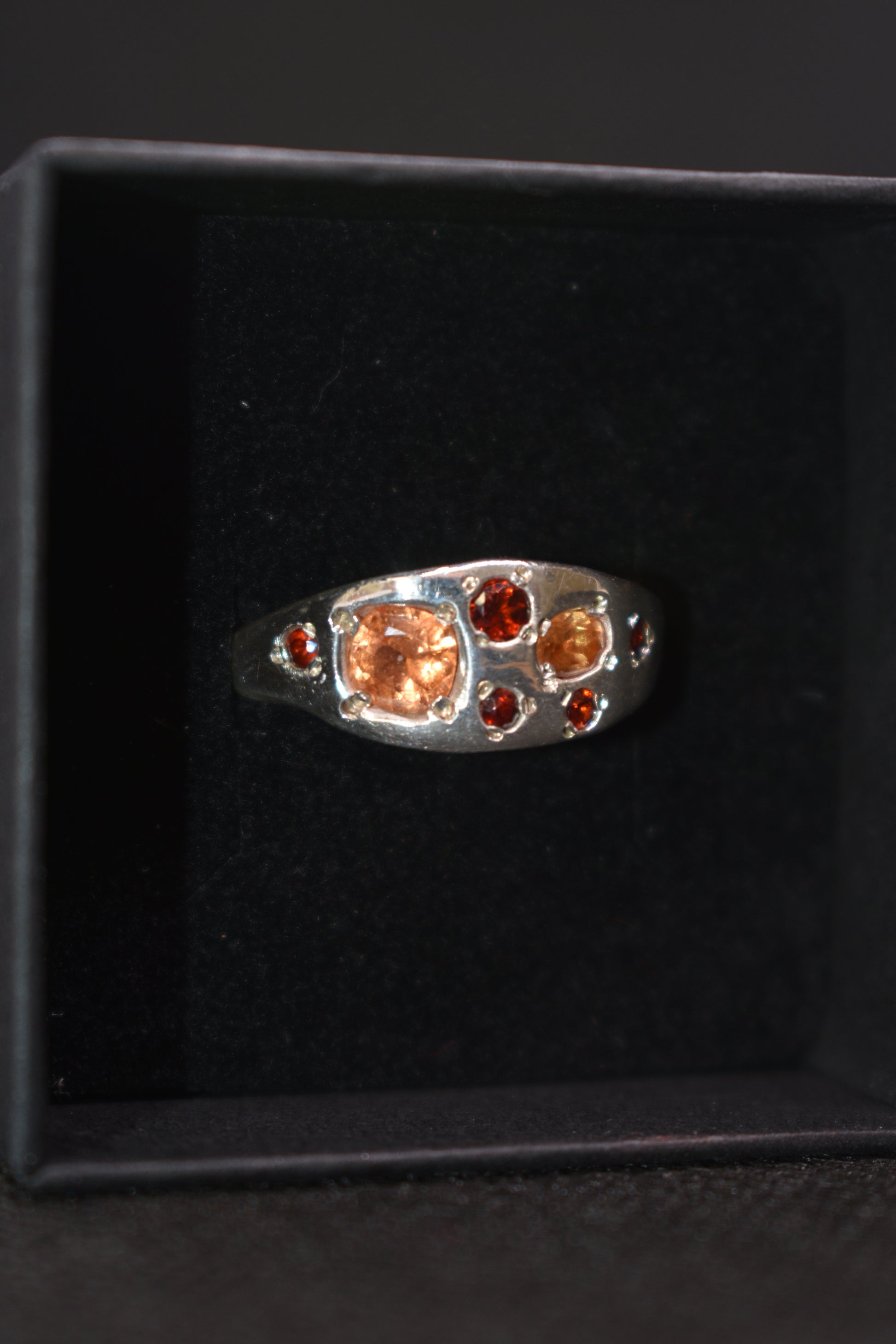 Stones: natural orange/yellow sapphires and red garnets.